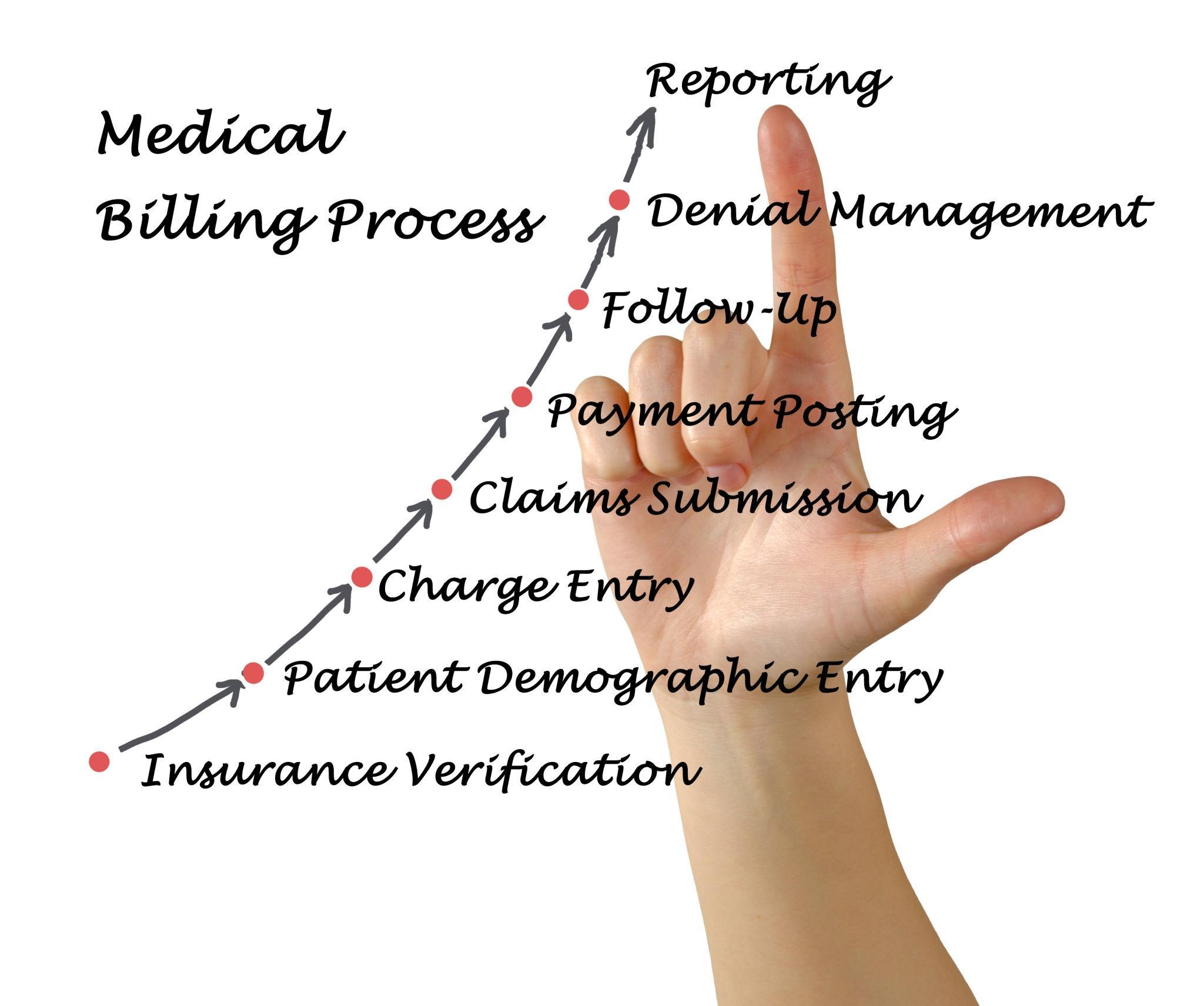 The process includes verifying insurance coverage, submitting claims to the payer, reviewing those claims, and resolving any issues before reimbursement is issued.